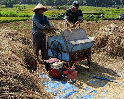 Babinsa Koramil 17/Wonosegoro Kodim 0724/Boyolali Serka Sofyanto bantu petani melaksanakan merontokan padi yang sudah dipanen dengan menggunakan mesin perontok padi di sawah bapak Jumadi bertempat di areal sawah Dukuh Dukuhan Desa Wonosegoro Kecamatan Wonosegoro Kabupaten Boyolali, Minggu (13/04/2025).