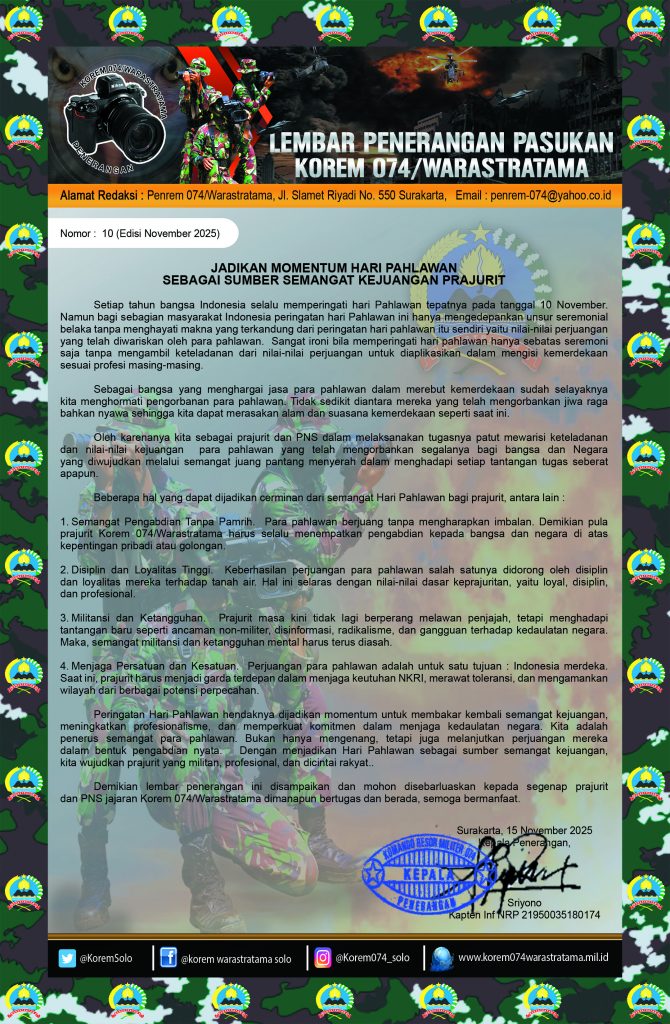 Komando Resort Militer 074/Warastratama, disingkat Korem 074/WRT, adalah Komando Teritorial bawah Kodam IV/Diponegoro. dibentuk 25 April 1965. Wilayah yang berada di bawah kendali Korem 074/Warastratama adalah kota-kota eks Karesidenan Surakarta (Solo, Sukoharjo, Karanganyar, Sragen, Klaten, Wonogiri dan Boyolali). Korem ini bermarkas di Surakarta.