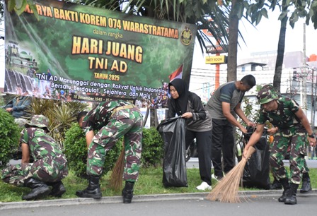 Dalam rangka memperingati Hari Juang TNI Angkatan Darat Tahun 2025, Prajurit dan PNS Korem 074/Warastratama melaksanakan Karya Bakti pembersihan di lingkungan sekitar wilayah Korem, Jumat (12/12/2025). Kegiatan ini menjadi salah satu bentuk kepedulian sekaligus pengabdian TNI AD kepada masyarakat melalui aksi nyata menjaga kebersihan dan kerapian lingkungan.
