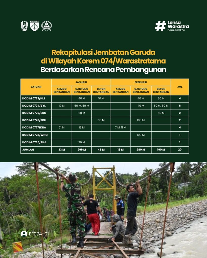 Di wilayah Korem 074/Warastratama, sejumlah Jembatan Garuda telah dibangun di titik-titik strategis yang sebelumnya sulit dijangkau. Keberadaan jembatan tersebut diharapkan dapat memperkuat konektivitas antarwilayah sekaligus menjadi pengungkit pertumbuhan ekonomi lokal secara berkelanjutan.