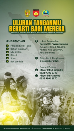 Uluran tangan sekecil apa pun sangat berarti bagi saudara-saudara kita yang terdampak bencana alam di berbagai wilayah Indonesia. Mari bergandeng tangan untuk membantu mereka yang sedang berjuang memulihkan hidupnya. Titipkan bantuanmu di Korem 074/Warastratama sebelum 5 Desember 2025. Contact Person:…