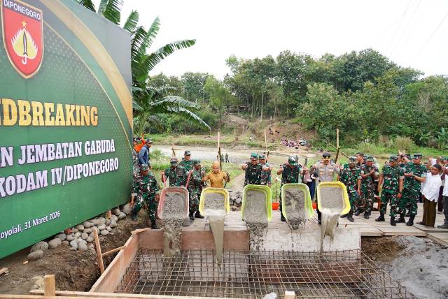 Pangdam IV/Diponegoro, Mayjen TNI Achiruddin, S.E., M.Han., melaksanakan peletakan batu pertama pembangunan jembatan gantung yang terletak di Desa Bolo, Kecamatan Wonosegoro, Kabupaten Boyolali, Selasa (31/03/2026). Dalam kegiatan tersebut, Pangdam didampingi oleh Danrem 074/Warastratama, Kolonel Inf M. Arry Yudistira, S.I.P., M.I.Pol.,…