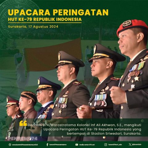 Komandan Korem 074/Warastratama Kolonel Inf Ali Akhwan, S.E., bersama jajaran Forkopimda Surakarta menghadiri upacara peringatan HUT ke-79 Kemerekaan Republik Indonesia 2024 di Stadion Sriwedari Surakarta, Sabtu (17/08/2024). Upacara dalam rangka puncak peringatan HUT RI, berlangsung dalam suasana tertib dan khidmat,…