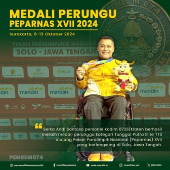 Atlet tenis meja disabilitas asal Kodim 0723/Klaten, Serka Andi Santoso, 36, meraih medali perunggu dalam ajang Pekan Paralympic Nasional (Peparnas) XVII 2024 di Solo. Prajurit TNI yang saat ini berdinas di Kodim 0723/Klaten dipaksa puas dengan membawa pulang mendali perunggu…
