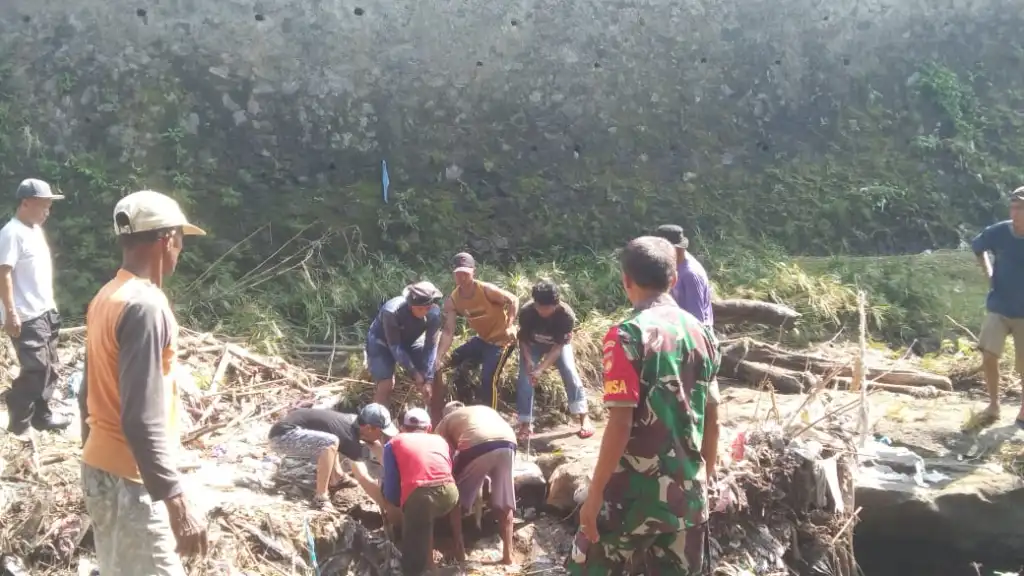 Lima (5) Anggota Koramil 09/Sawit Kodim 0724/Boyolali yang dipimpin Danramil 09/Sawit Kapten Inf Suparman bersama warga bergotong royong membersihkan sungai di Desa Jatirejo Kecamatan Sawit Kabupaten Boyolali, Minggu (06/04/2025). Kegiatan diawali dengan apel bersama dan dilanjutkan pembersihan, dengan alat seadanya…
