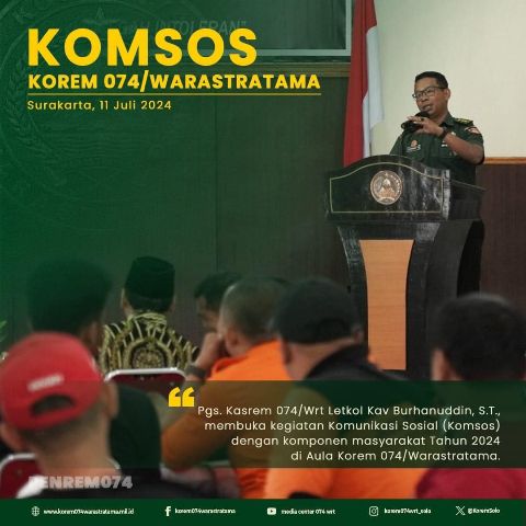Korem 074/Warastratama gelar kegiatan Komunikasi Sosial (Komsos) dengan komponen masyarakat Tahun 2024 yang bertemakan “Bersama Merawat Kebhinekaan, Mencegah Intoleran” yang dipimpin oleh Pgs. Kasrem 074/Warastratama Letkol Kav Burhanuddin, S.T., sekaligus membacakan sambutan Danrem 074/Warastratama Kolonel Inf Ali Akhwan, S.E, Kamis…