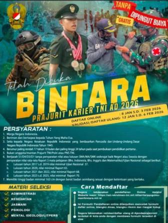 Saatnya putra-putri terbaik bangsa mengabdikan diri untuk NKRI. Daftarkan dirimu dan jadilah prajurit TNI Angkatan Darat yang profesional, tangguh, dan berkarakter.