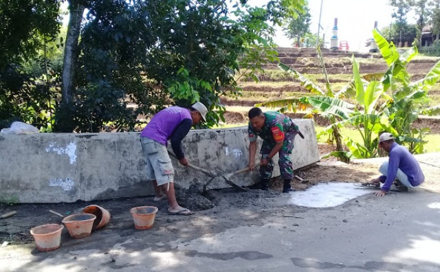 Babinsa Bejen Koramil 01/Karanganyar Kodim 0727/Karanganyar Koptu Joko Dwi bersama warga melaksanakan kegiatan karya bhakti perbaikan jembatan/betonisasi landasan jembatan, di Lingkungan Wonorejo Kelurahan Bejen yang rusak akibat tergerus air hujan. Kegiatan perbaikan dilakukan bersama warga dengan menghidupkan budaya gotong royong…