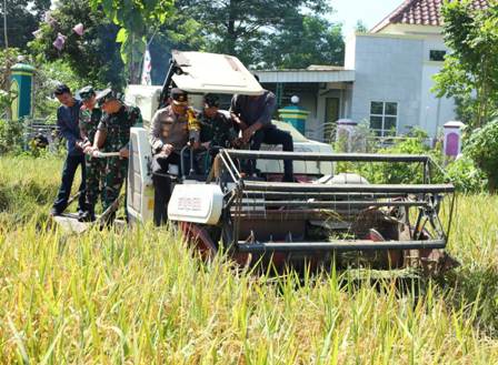 Babinsa Koramil 17/Wonosegoro Kodim 0724/Boyolali Serka Sofyanto bantu petani melaksanakan merontokan padi yang sudah dipanen dengan menggunakan mesin perontok padi di sawah bapak Jumadi bertempat di areal sawah Dukuh Dukuhan Desa Wonosegoro Kecamatan Wonosegoro Kabupaten Boyolali, Minggu (13/04/2025). Babinsa Serka…