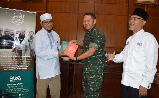 Korem 074/Warastratama menerima 400 wakaf Al Qur’an dari Badan Wakaf Al Qur’an Indonesia Cabang Surakarta, Selasa (26/3/2019). Ratusan Alquran itu diserahkan secara simbolis oleh Ketua Badan Wakaf Al Qur’an Indonesia Cabang Surakarta Bapak Erlan kepada Komandan Korem 074/Warastratama Kolonel Inf…