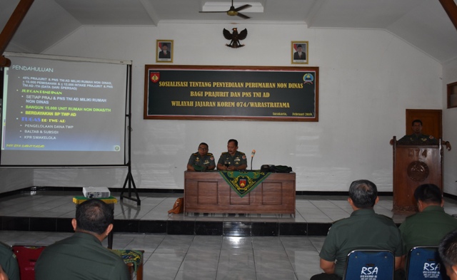 Korem 074/Warastratama terima kunjungan Puldata Penyusunan Kajian Sahli Kasad bidang Ekonomi dengan judul “Penyediaan Perumahan Non Dinas bagi Prajurit dan PNS TNI AD guna meningkatkan kesejahteraan dalam rangka mendukung tugas pokok TNI AD”, Kamis (14/02/2019). Kopoksahli Kasad Bidang Ekonomi Brigjen…
