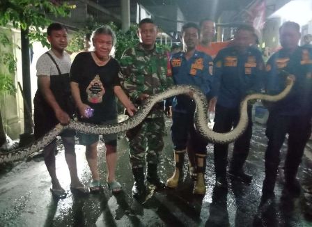 Babinsa Kelurahan Kampung Baru Koramil 05/Pasar Kliwon Kodim 0735/Surakarta Sertu Sugeng Haryadi bersama dengan petugas Damkar Kota Surakarta berhasil mengevakuasi ular piton sepanjang 3,5 meter di jl. Nusa Penida Kelurahan Kampung Baru RT.01/01 Kecamatan Pasar Kliwon, Kota Surakarta, Sabtu (08/03/2025)…