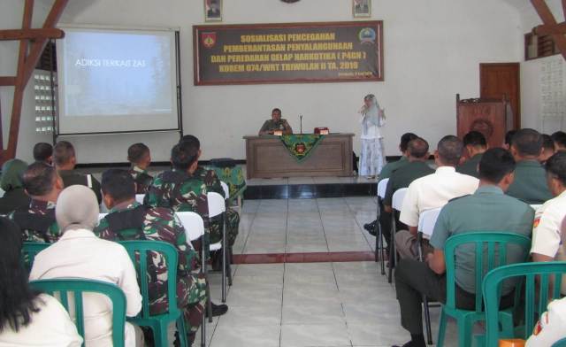 Korem 074/Warastratama menggelar Sosialisasi Pencegahan Pemberantasan Penyalahgunaan dan Peredaran Gelap Narkoba (P4GN) bagi personel Korem 074/Warastratama dan Balak Aju Kodam IV/Diponegoro, Senin (17/6/2019). Sebanyak 120 Personel mengikuti Kegiatan Sosialisasi P4GN ini. Kegiatan ini digelar dalam rangka mewujudkan lingkungan Korem 074/Warastratama…